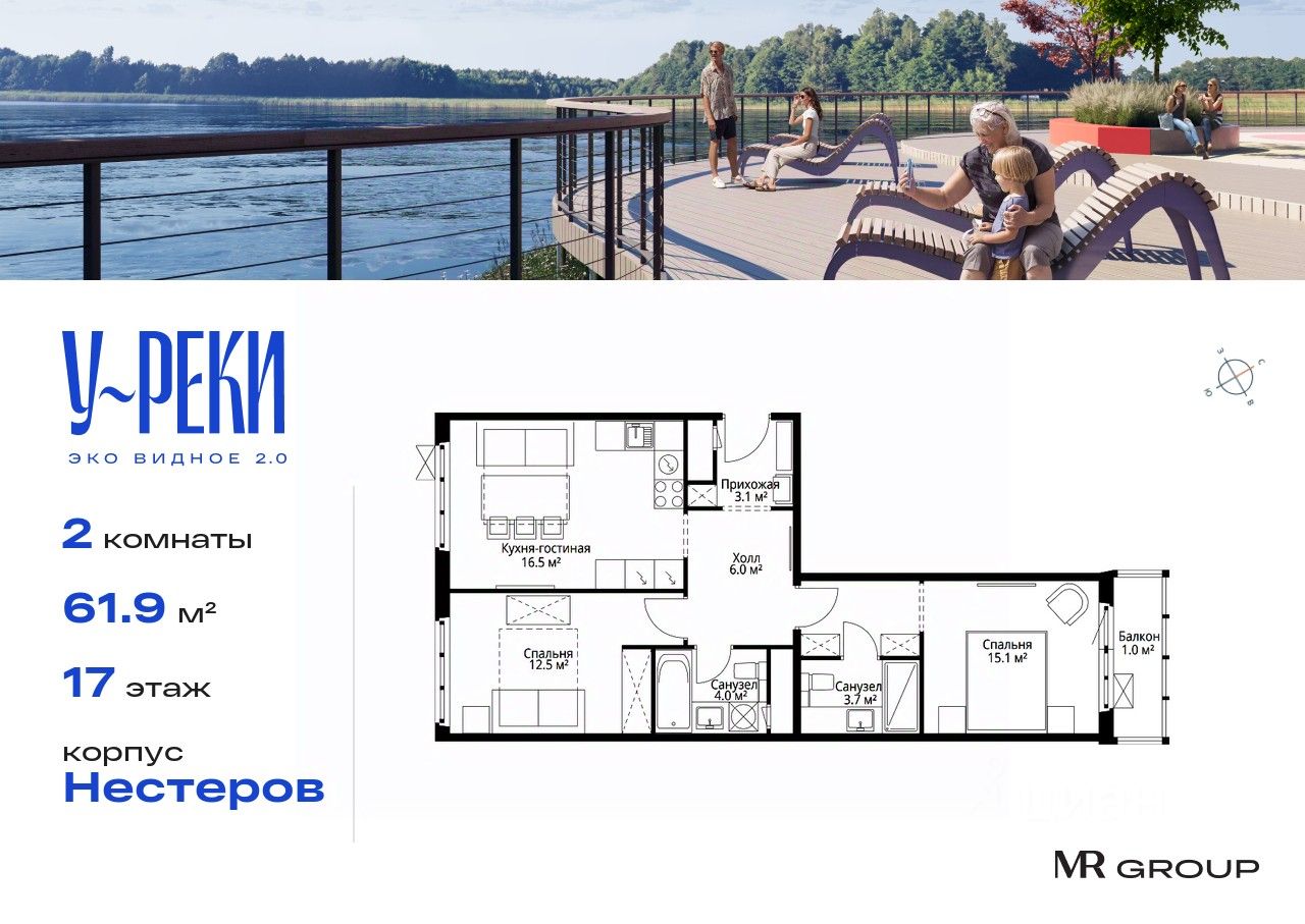 Продаётся 2-комнатная квартира общей площадью 61.90 м² с предчистовой отделкой в ЖК "У реки. Эко Видное 2.0" на 17-м этаже корпуса Нестеров.