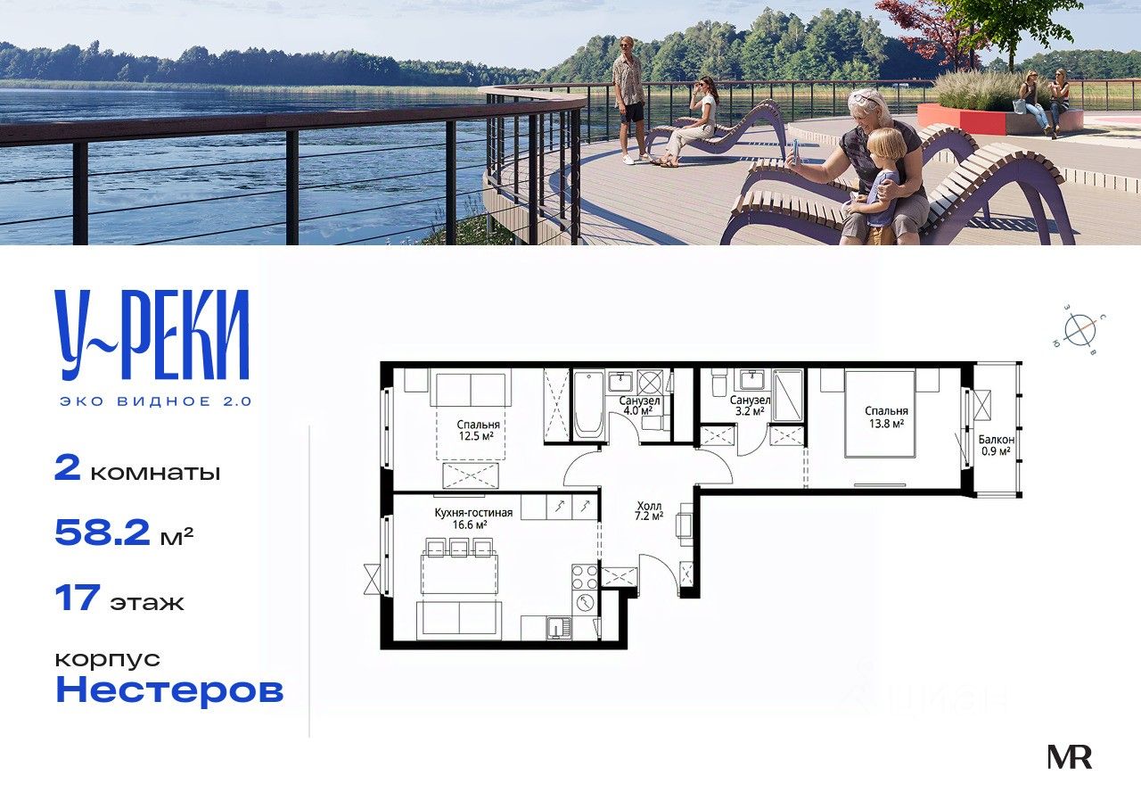 Продаётся 2-комнатная квартира общей площадью 58.20 м² с предчистовой отделкой в ЖК "У реки. Эко Видное 2.0" на 17-м этаже корпуса Нестеров.