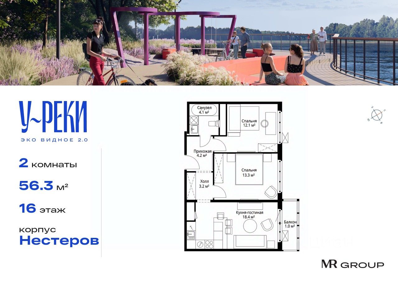 Продаётся 2-комнатная квартира общей площадью 56.30 м² с предчистовой отделкой в ЖК "У реки. Эко Видное 2.0" на 16-м этаже корпуса Нестеров.