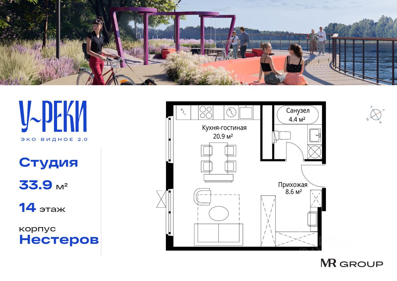 Продаётся студия общей площадью 33.90 м² с предчистовой отделкой в ЖК "У реки. Эко Видное 2.0" на 14-м этаже корпуса Нестеров.