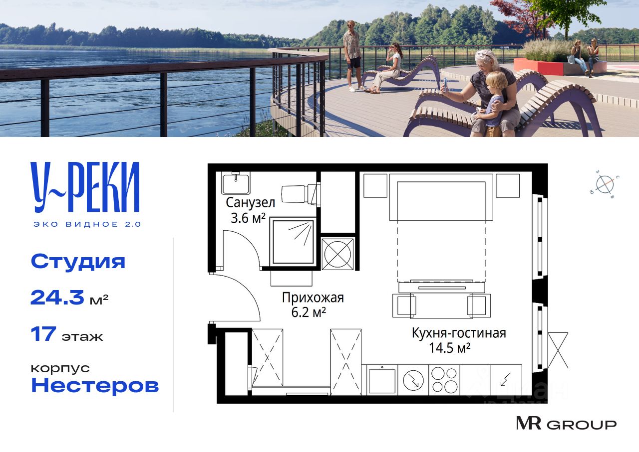 Продаётся студия общей площадью 24.30 м² с предчистовой отделкой в ЖК "У реки. Эко Видное 2.0" на 17-м этаже корпуса Нестеров.