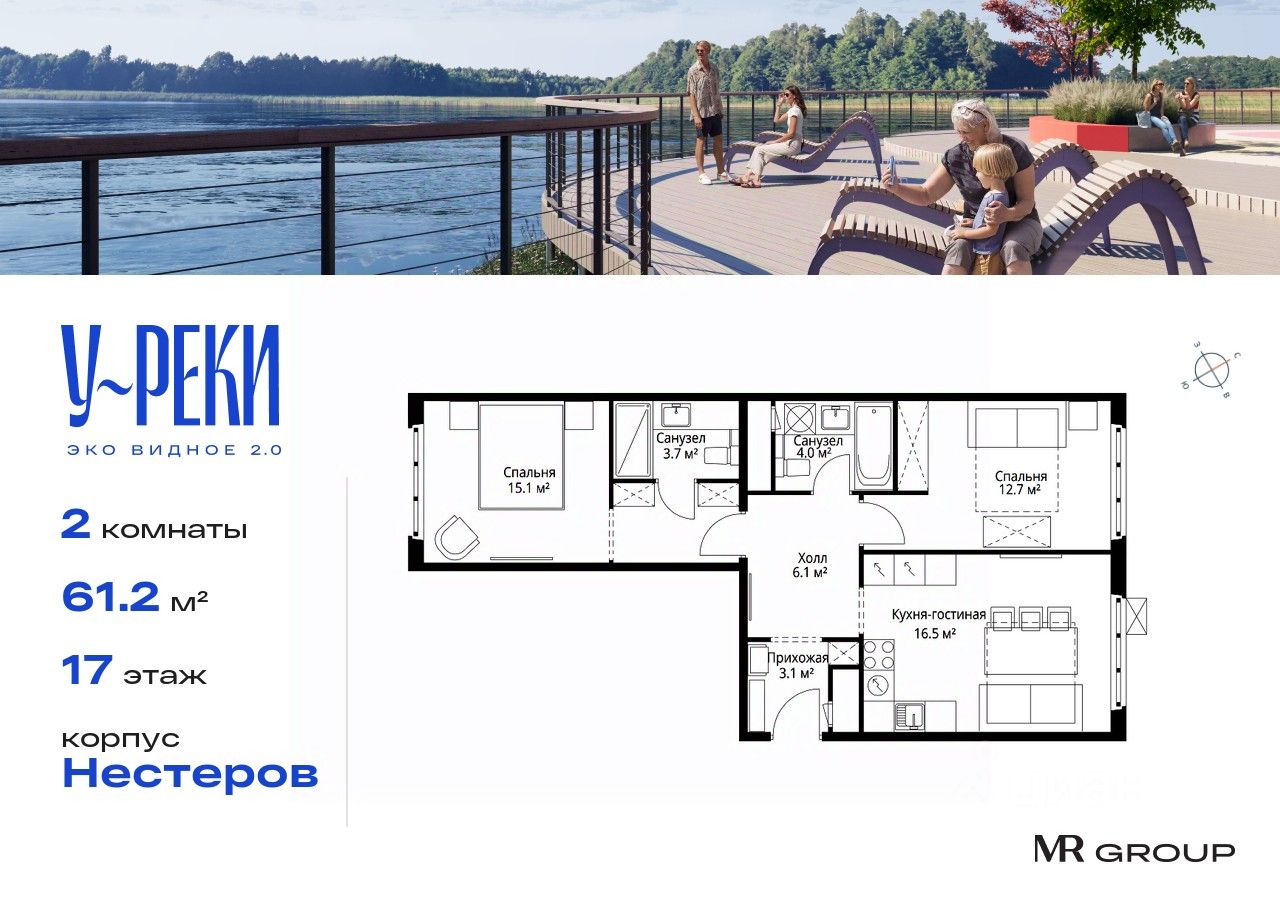 Продаётся 2-комнатная квартира общей площадью 61.20 м² с предчистовой отделкой в ЖК "У реки. Эко Видное 2.0" на 17-м этаже корпуса Нестеров.