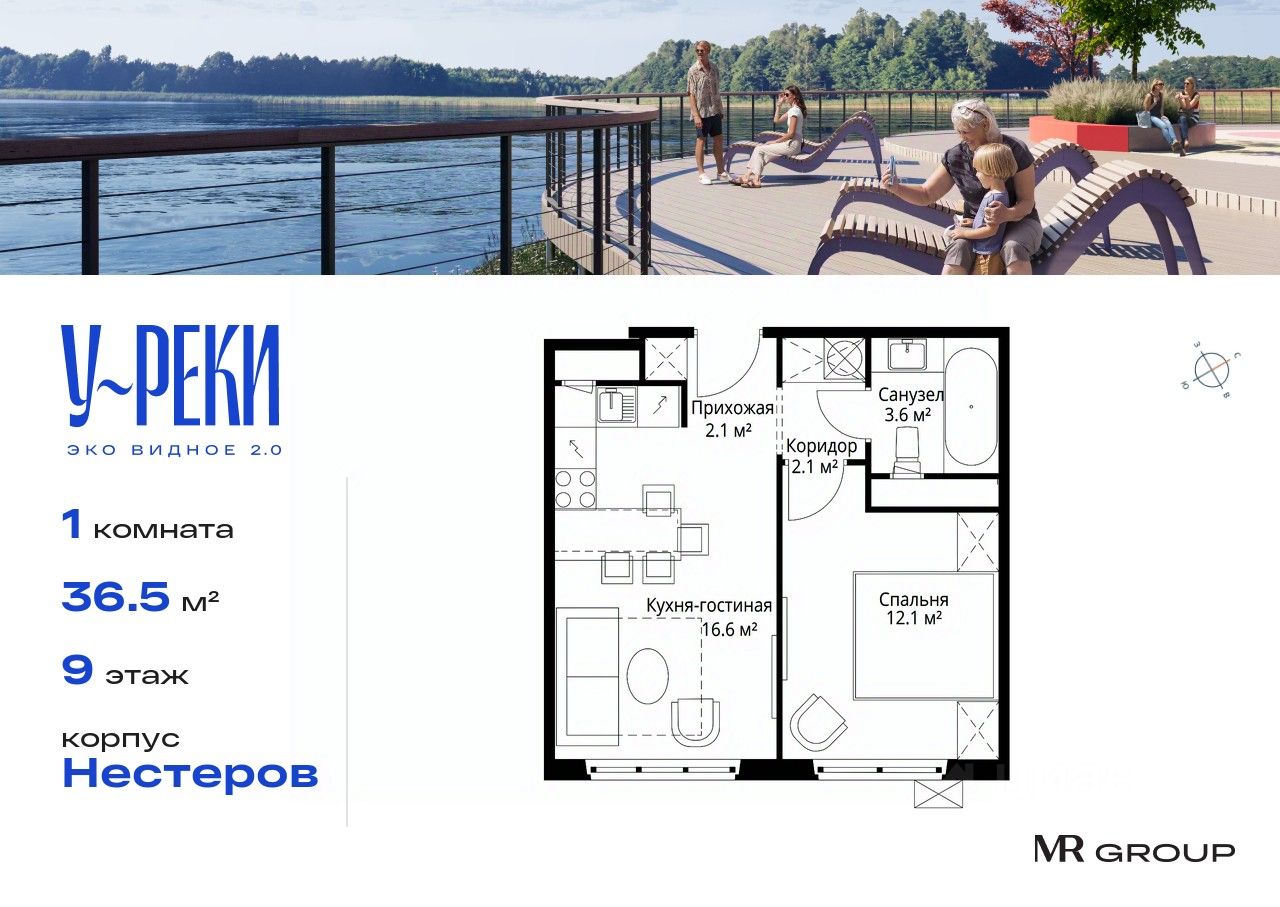 Продаётся 1-комнатная квартира общей площадью 36.50 м² с предчистовой отделкой в ЖК "У реки. Эко Видное 2.0" на 9-м этаже корпуса Нестеров.
