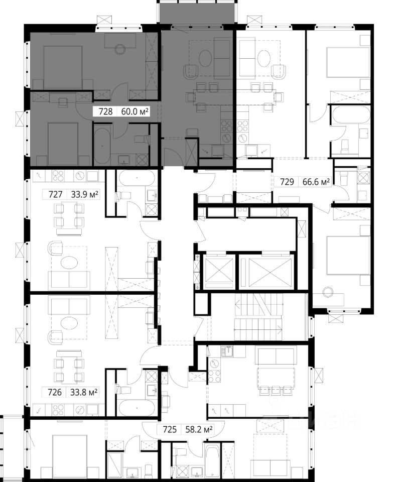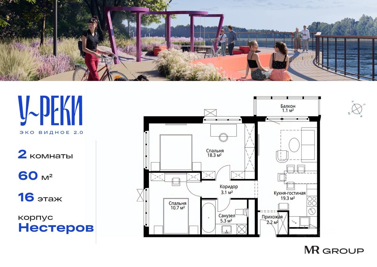 Продаётся 2-комнатная квартира общей площадью 60 м² с предчистовой отделкой в ЖК "У реки. Эко Видное 2.0" на 16-м этаже корпуса Нестеров.