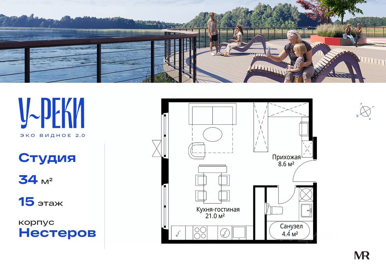 Продаётся студия общей площадью 34 м² с предчистовой отделкой в ЖК "У реки. Эко Видное 2.0" на 15-м этаже корпуса Нестеров.