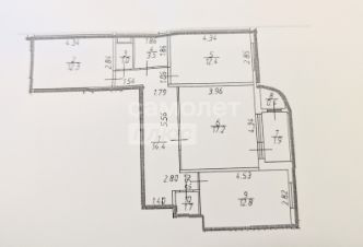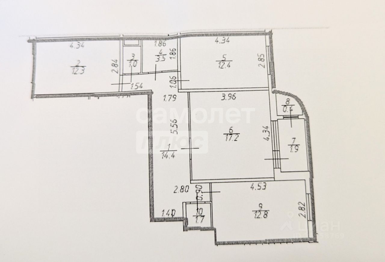 - квартира-распашонка, три изолированные комната 12,3 м², 12,4 м² и 17,2 м²,