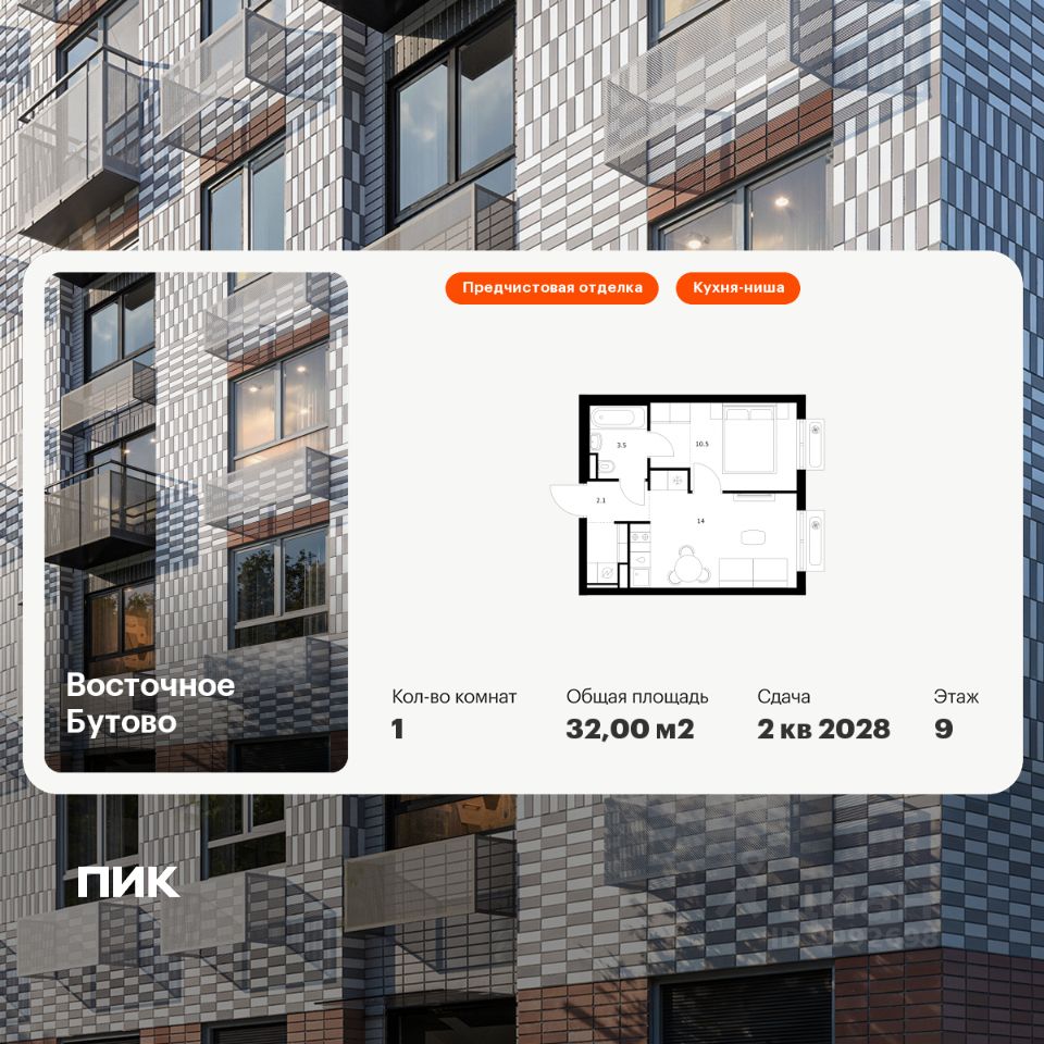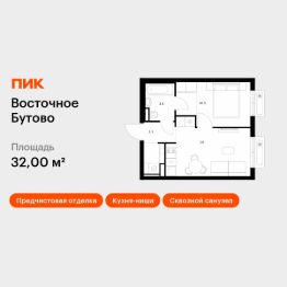 Продаётся 1-комн. квартира площадью 32 кв.м на 9 этаже 17 этажного дома (Корпус 48, Секция 2) проекта ПИК Восточное Бутово. Светлый просторный подъезд на уровне земли, функциональная планировка, большие окна, предчистовая отделка.