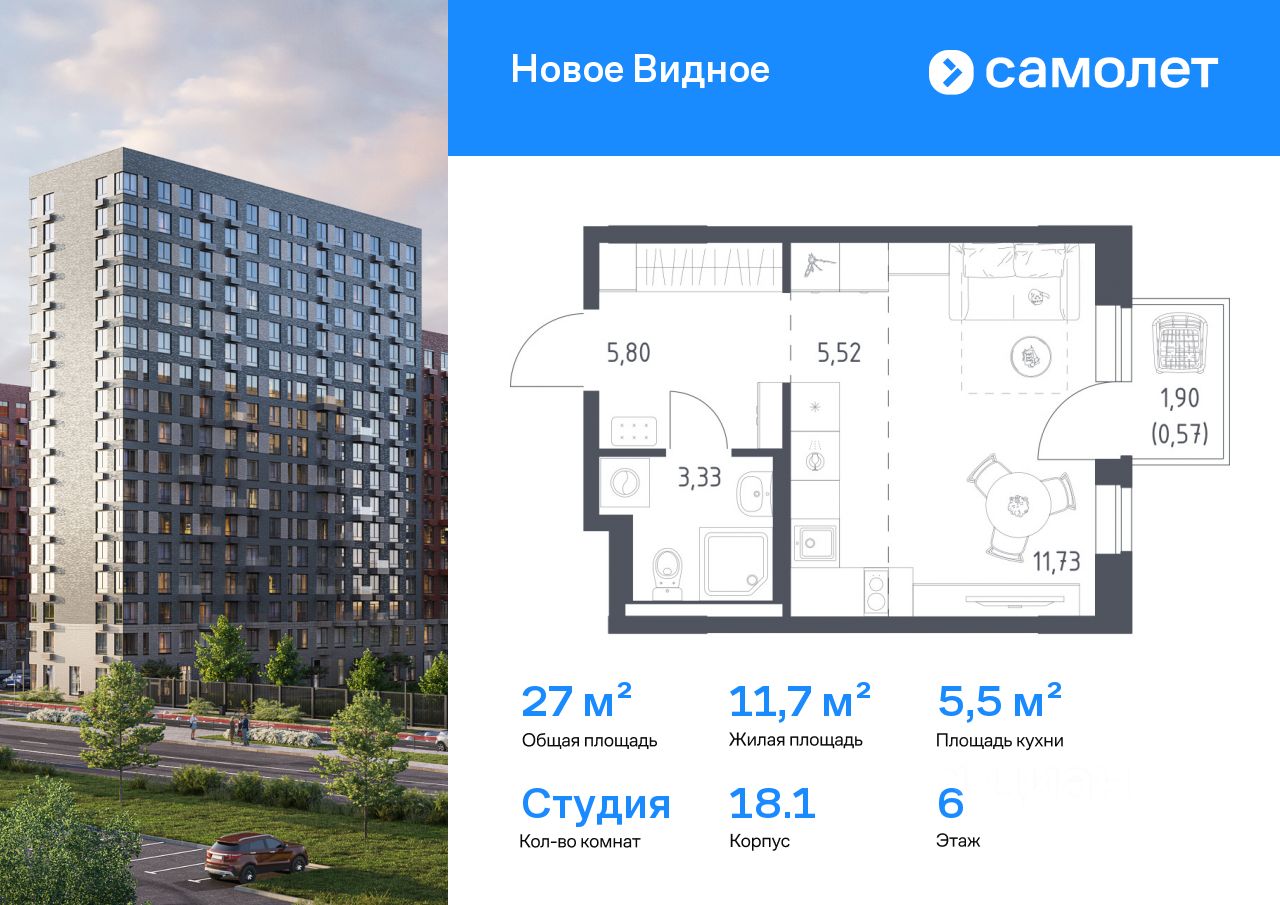 Предлагается квартира студия комфорт-класса 26,95 кв.м в корпусе 18.1 на 6 этаже, в ЖК "Новое Видное"