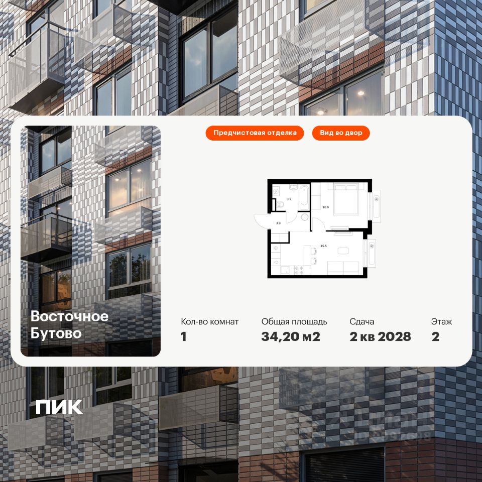 Продаётся 1-комн. квартира площадью 34,2 кв.м на 2 этаже 15 этажного дома (Корпус 48, Секция 3) проекта ПИК Восточное Бутово. Светлый просторный подъезд на уровне земли, функциональная планировка, большие окна, предчистовая отделка.