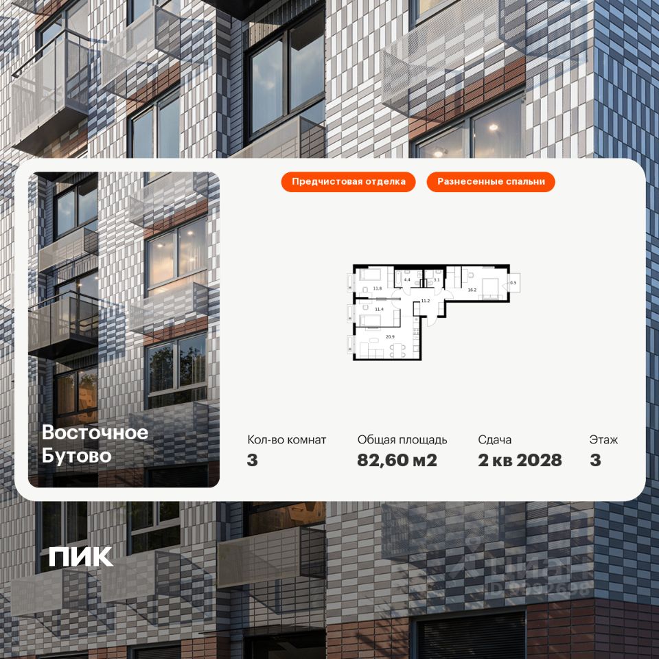 Продаётся 3-комн. квартира площадью 82,6 кв.м на 3 этаже 17 этажного дома (Корпус 48, Секция 1) проекта ПИК Восточное Бутово. Светлый просторный подъезд на уровне земли, функциональная планировка, большие окна, предчистовая отделка.