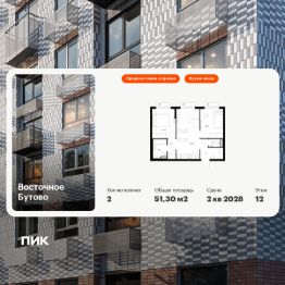 Продаётся 2-комн. квартира площадью 51,3 кв.м на 12 этаже 25 этажного дома (Корпус 48, Секция 4) проекта ПИК Восточное Бутово. Светлый просторный подъезд на уровне земли, функциональная планировка, большие окна, предчистовая отделка.