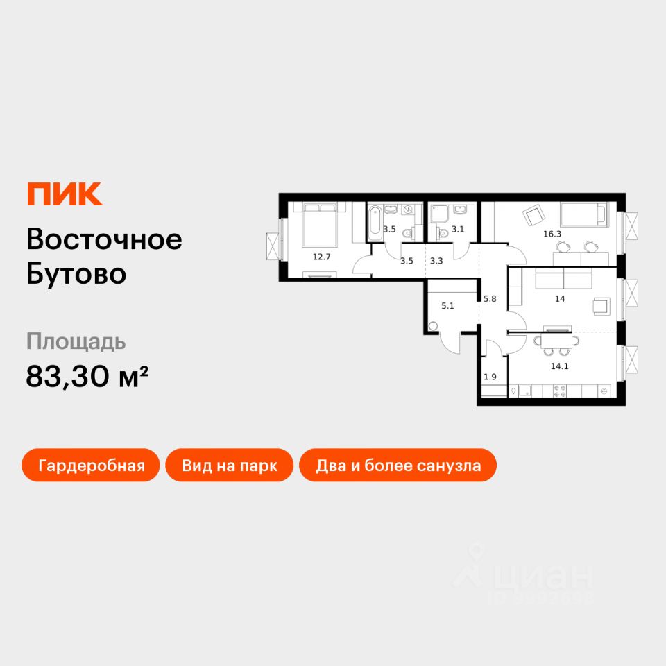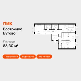 Продаётся 3-комн. квартира площадью 83,3 кв.м на 13 этаже 16 этажного дома (Корпус 17, Секция 2) проекта ПИК Восточное Бутово. Светлый просторный подъезд на уровне земли, функциональная планировка, большие окна, c отделкой.