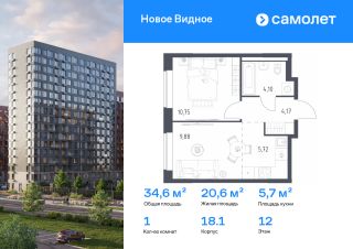 Предлагается 1-комнатная квартира комфорт-класса 34,62 кв.м в корпусе 18.1 на 12 этаже, в ЖК "Новое Видное"