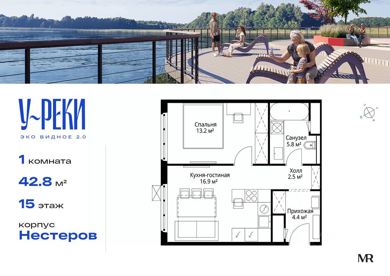 Продаётся 1-комнатная квартира общей площадью 42.80 м² с предчистовой отделкой в ЖК "У реки. Эко Видное 2.0" на 15-м этаже корпуса Нестеров.