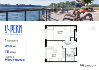 Продаётся 1-к квартира общей площадью 31.50 м² с предчистовой отделкой в ЖК "У реки. Эко Видное 2.0" на 13-м этаже корпуса Нестеров.