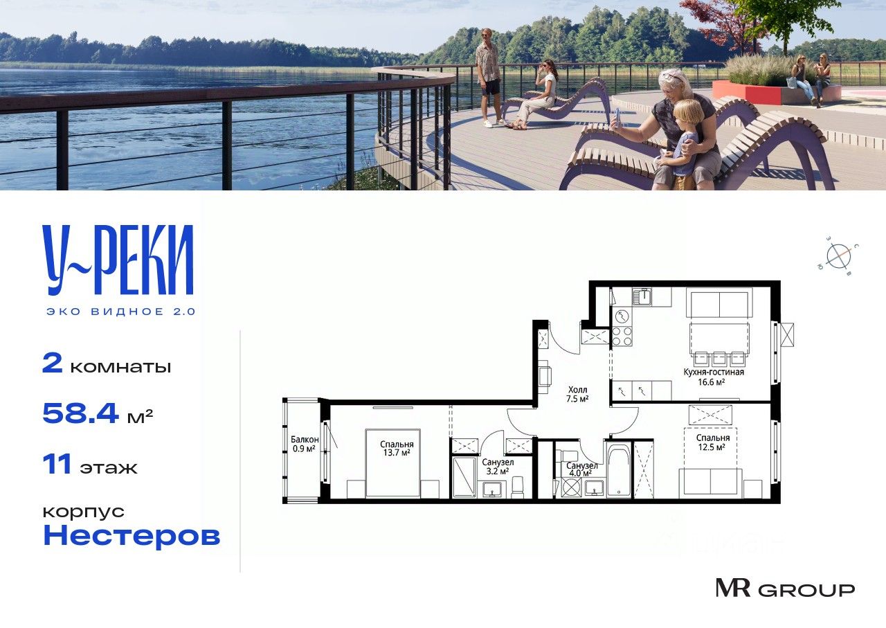 Продаётся 2-к квартира общей площадью 58.40 м² с предчистовой отделкой в ЖК "У реки. Эко Видное 2.0" на 11-м этаже корпуса Нестеров.