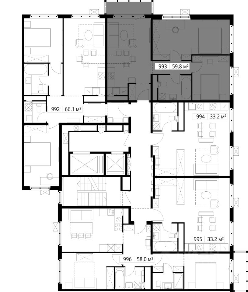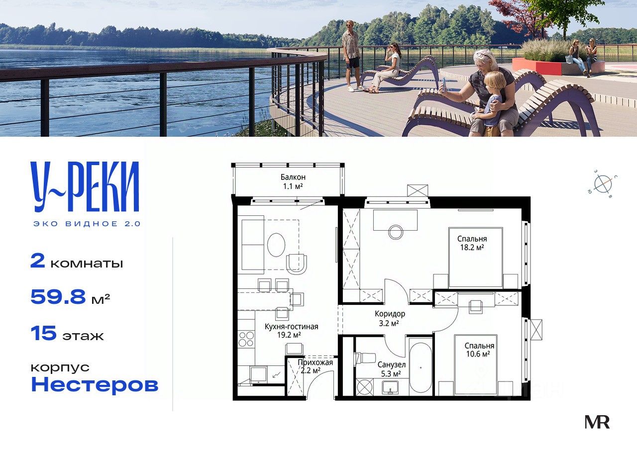 Продаётся 2-комнатная квартира общей площадью 59.80 м² с предчистовой отделкой в ЖК "У реки. Эко Видное 2.0" на 15-м этаже корпуса Нестеров.