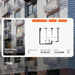 Продаётся 2-комн. квартира площадью 57,2 кв.м на 17 этаже 17 этажного дома (Корпус 48, Секция 2) проекта ПИК Восточное Бутово. Светлый просторный подъезд на уровне земли, функциональная планировка, большие окна, предчистовая отделка.