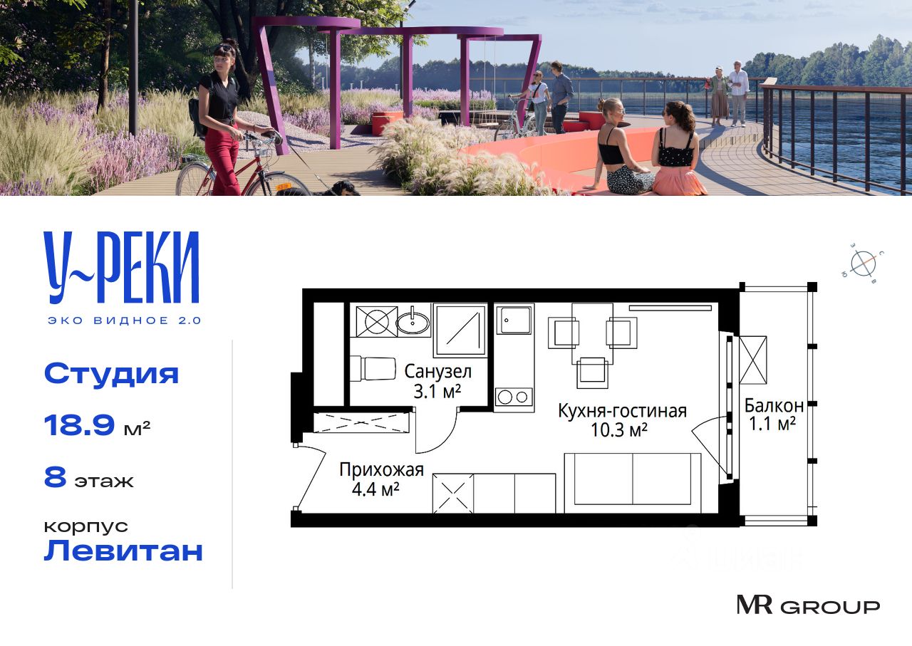 Продаётся студия общей площадью 18.90 м² с чистовой отделкой в ЖК "У реки. Эко Видное 2.0" на 8-м этаже 17 этажного корпуса Левитан.