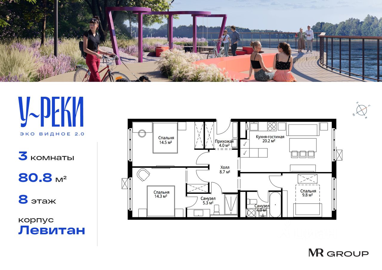 Продаётся 3-комнатная квартира общей площадью 80.80 м² с чистовой отделкой в ЖК "У реки. Эко Видное 2.0" на 8-м этаже 17 этажного корпуса Левитан.