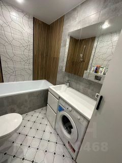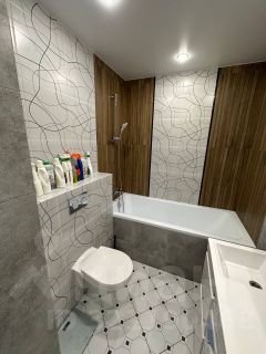 Совмещенный санузел оборудован ванной, унитазом с инсталляцией, раковиной со шкафом-зеркалом и вместительным пеналом. Отделочные материалы в ванной комнате подобраны в стильной цветовой гамме.