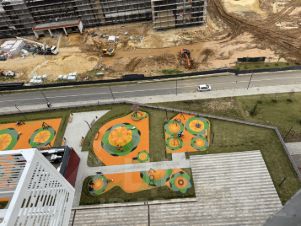 Во дворе — безопасные детские и спортивные площадки, много зелени, широкие тротуары;