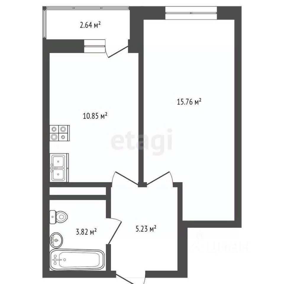 Большая светлая комната 16 кв.м., вместительная и просторная кухня 10,85 кв.м., санузел совмещенный.