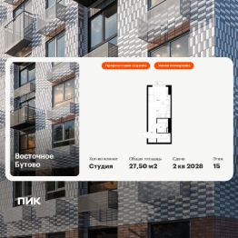 Продаётся квартира-студия площадью 27,5 кв.м на 15 этаже 15 этажного дома (Корпус 47, Секция 2) проекта ПИК Восточное Бутово. Светлый просторный подъезд на уровне земли, функциональная планировка, большие окна, предчистовая отделка.
