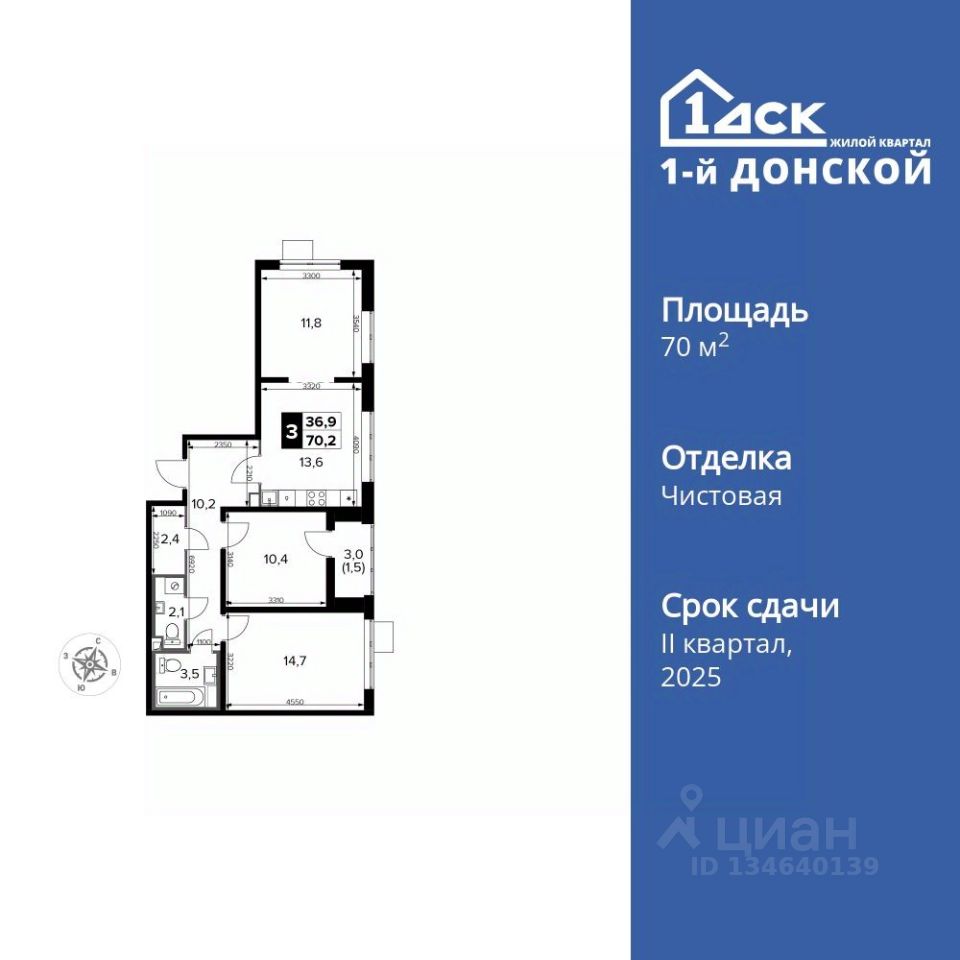 Продаётся 3-к квартира номер 160 общей площадью 70.2 кв.м. на 20-м этаже 21 этажного здания. Чистовая отделка. Цена с учётом скидки.