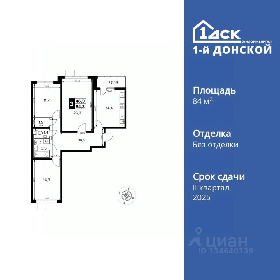 Продаётся 3-к квартира номер 439 общей площадью 84.3 кв.м. на 18-м этаже 24 этажного здания. Отделка Whitebox. Цена с учётом скидки.