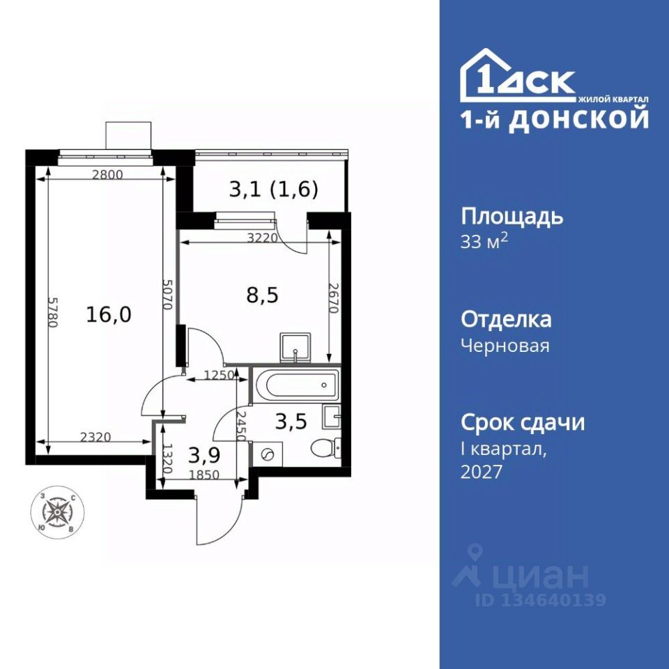 Продаётся 1-к квартира номер 224 общей площадью 33.5 кв.м. на 22-м этаже 24 этажного здания. Без отделки.