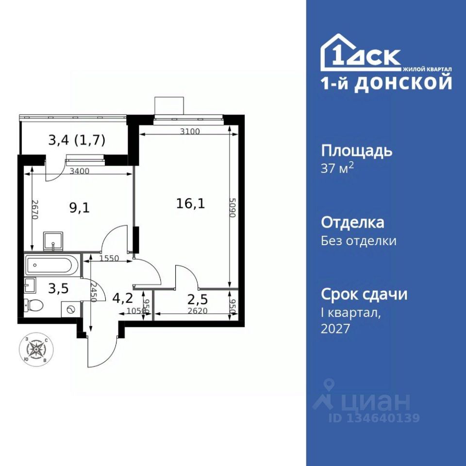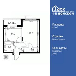 Продаётся 1-к квартира номер 60 общей площадью 37.1 кв.м. на 7-м этаже 24 этажного здания. Без отделки.