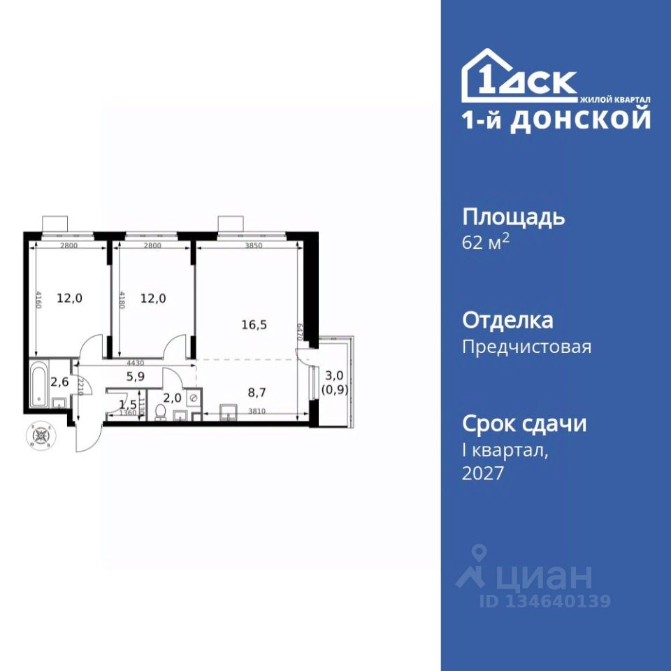 Продаётся 3-к квартира номер 140 общей площадью 62.1 кв.м. на 14-м этаже 24 этажного здания. Отделка Whitebox. Цена с учётом скидки.