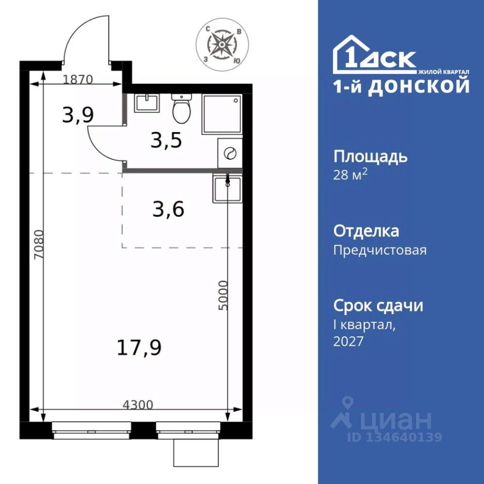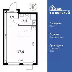 Продаётся квартира-студия номер 277 общей площадью 28.9 кв.м. на 3-м этаже 24 этажного здания. Отделка Whitebox.