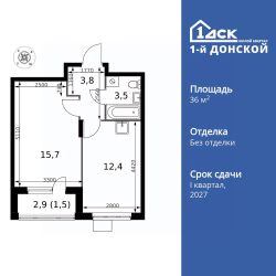 Продаётся 1-к квартира номер 291 общей площадью 36.9 кв.м. на 5-м этаже 24 этажного здания. Без отделки.
