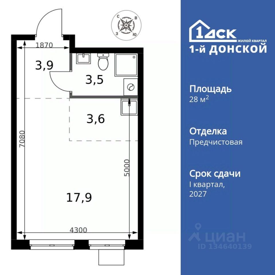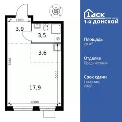 Продаётся квартира-студия номер 265 общей площадью 28.9 кв.м. на 2-м этаже 24 этажного здания. Отделка Whitebox.