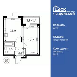 Продаётся 1-к квартира номер 403 общей площадью 32.4 кв.м. на 14-м этаже 24 этажного здания. Отделка Whitebox.