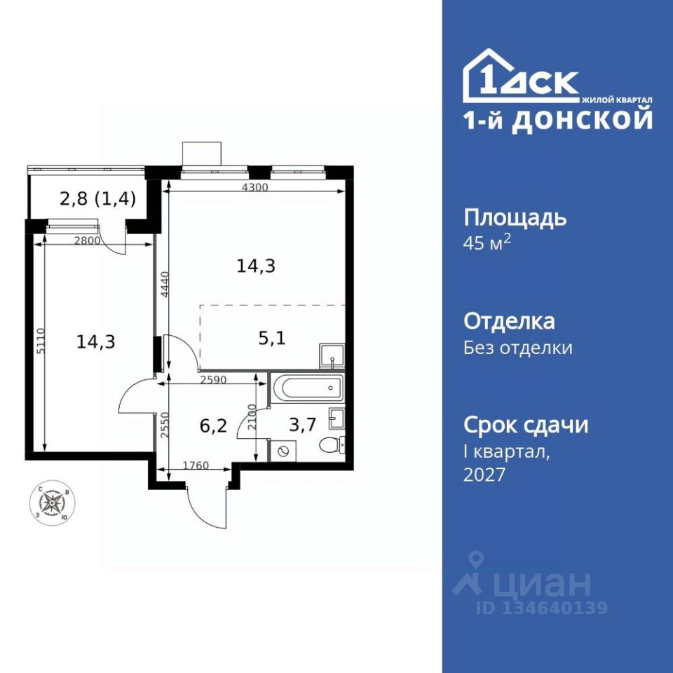 Продаётся 2-к квартира номер 753 общей площадью 45 кв.м. на 22-м этаже 24 этажного здания. Без отделки.