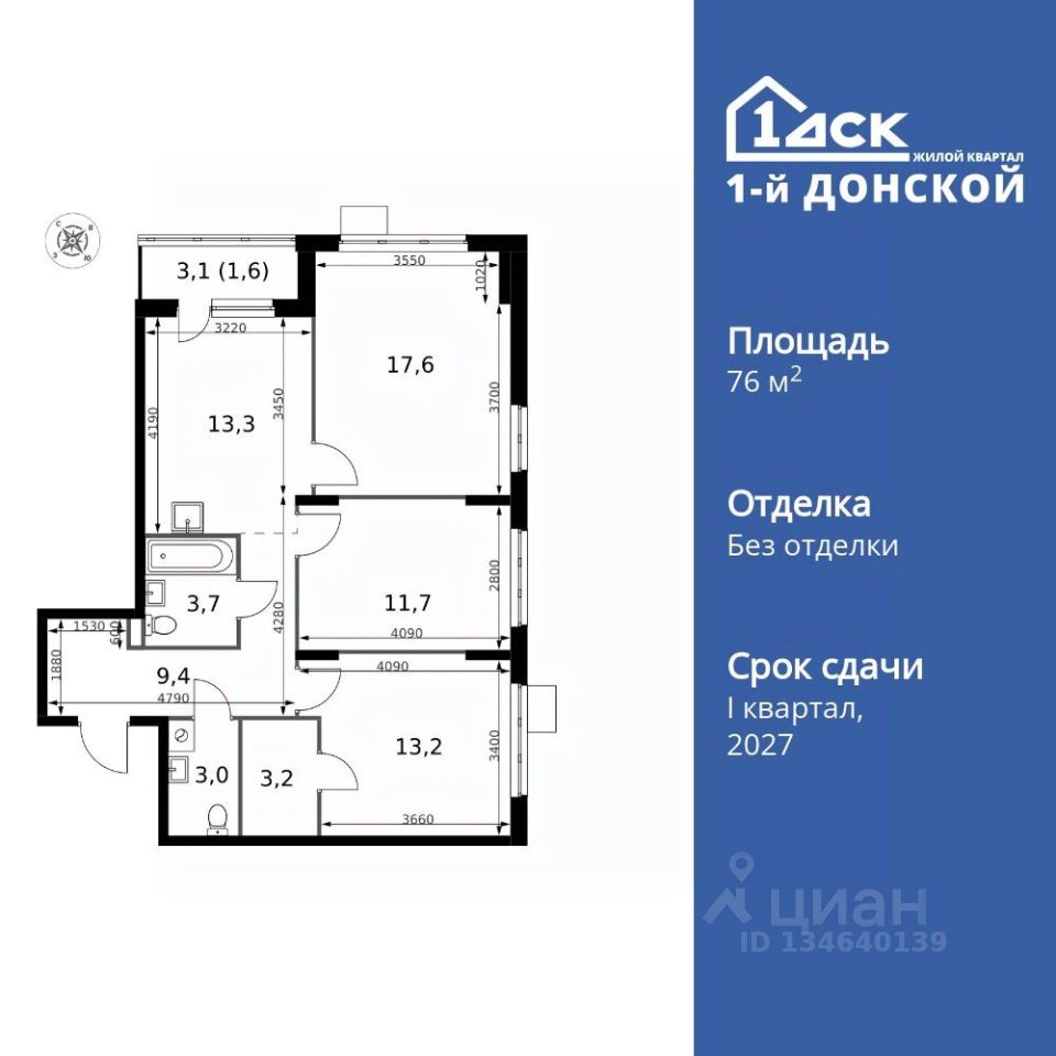 Продаётся 3-к квартира номер 623 общей площадью 76.7 кв.м. на 10-м этаже 24 этажного здания. Без отделки.