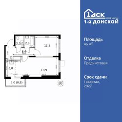 Продаётся 2-к квартира номер 681 общей площадью 46.5 кв.м. на 15-м этаже 24 этажного здания. Отделка Whitebox.
