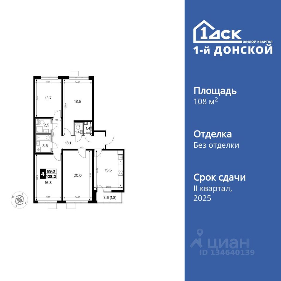 Продаётся 4-к квартира номер 196 общей площадью 108.2 кв.м. на 7-м этаже 24 этажного здания. Отделка Whitebox. Цена с учётом скидки.
