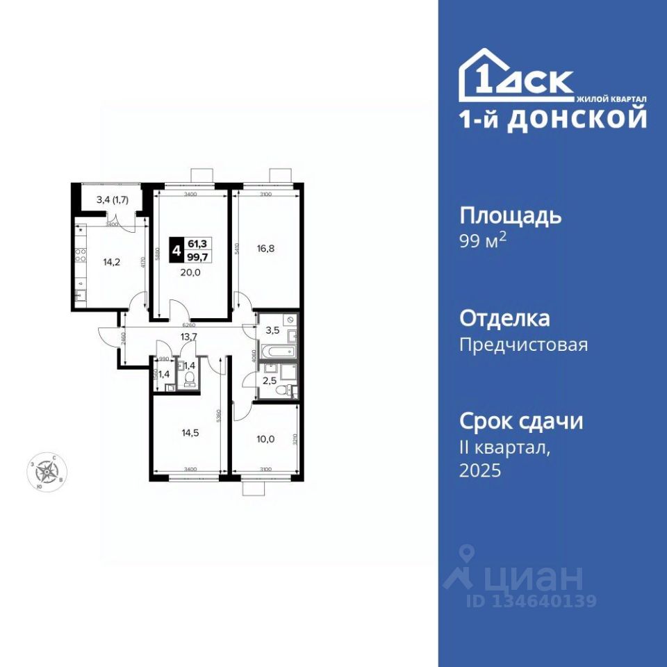 Продаётся 4-к квартира номер 392 общей площадью 99.7 кв.м. на 2-м этаже 20 этажного дома. Отделка Whitebox. Цена с учётом скидки!