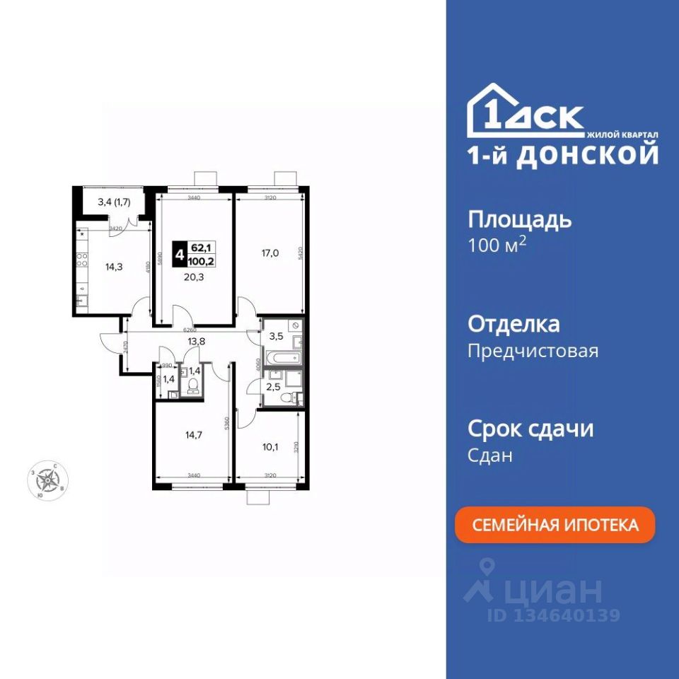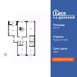 Продаётся 4-к квартира номер 440 общей площадью 100.7 кв.м. на 14-м этаже 20 этажного здания. Отделка Whitebox. Цена с учётом скидки.