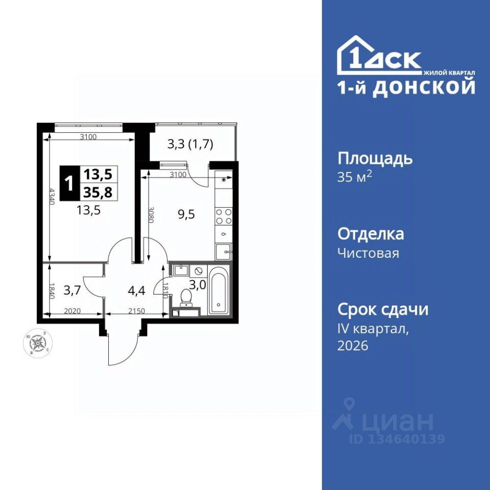 Продаётся 1-к квартира номер 6 общей площадью 35.8 кв.м. на 2-м этаже 24 этажного здания. Чистовая отделка.