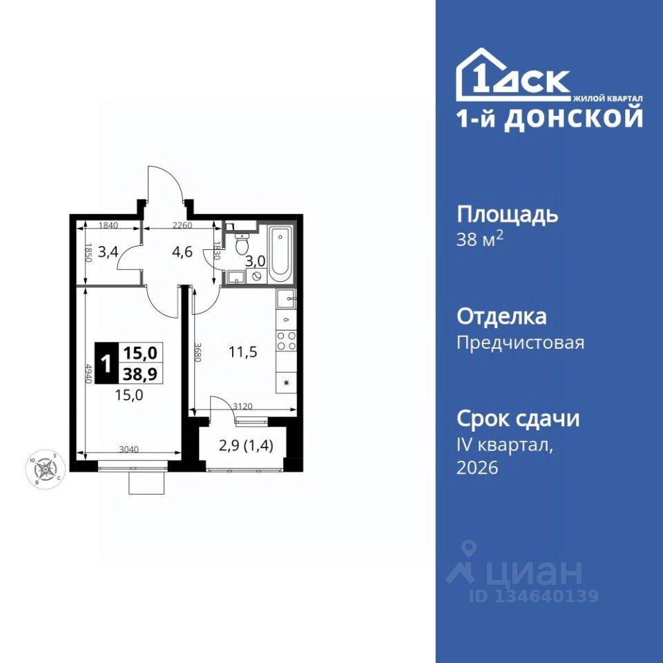 Продаётся 1-к квартира номер 374 общей площадью 38.9 кв.м. на 15-м этаже 24 этажного здания. Отделка Whitebox.