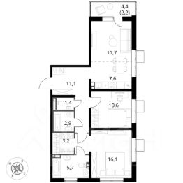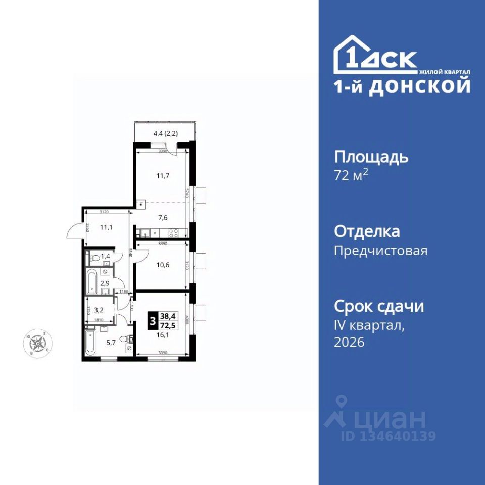 Продаётся 3-к квартира номер 283 общей площадью 72.5 кв.м. на 6-м этаже 24 этажного здания. Отделка Whitebox.