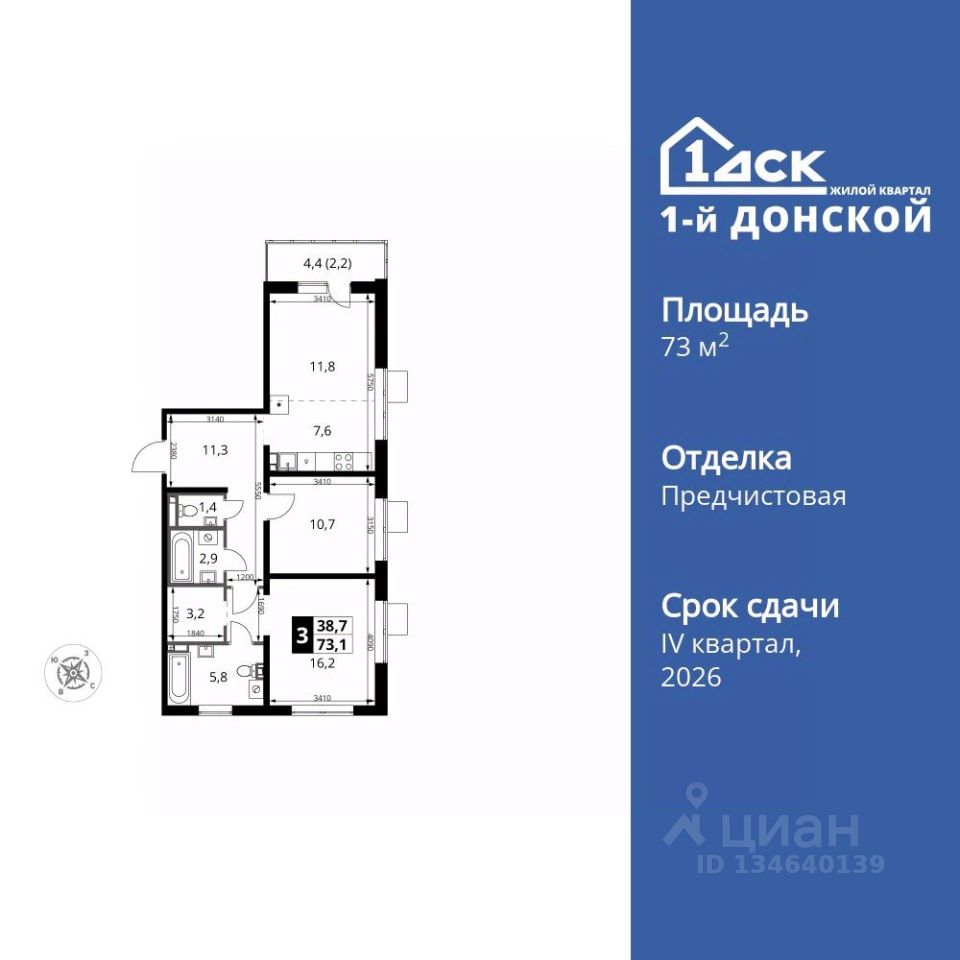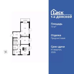 Продаётся 3-к квартира номер 437 общей площадью 73.1 кв.м. на 20-м этаже 24 этажного здания. Отделка Whitebox.