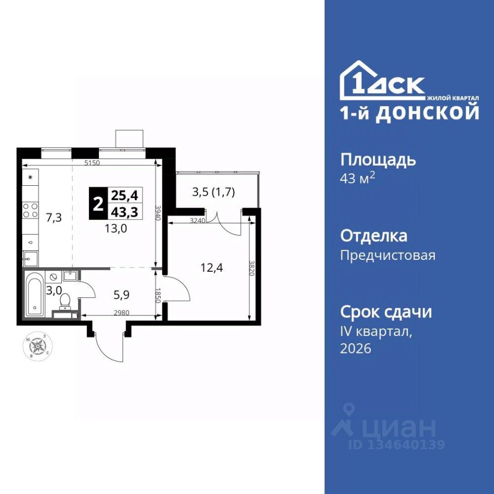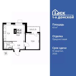 Продаётся 2-к квартира номер 458 общей площадью 43.3 кв.м. на 22-м этаже 24 этажного здания. Отделка Whitebox.