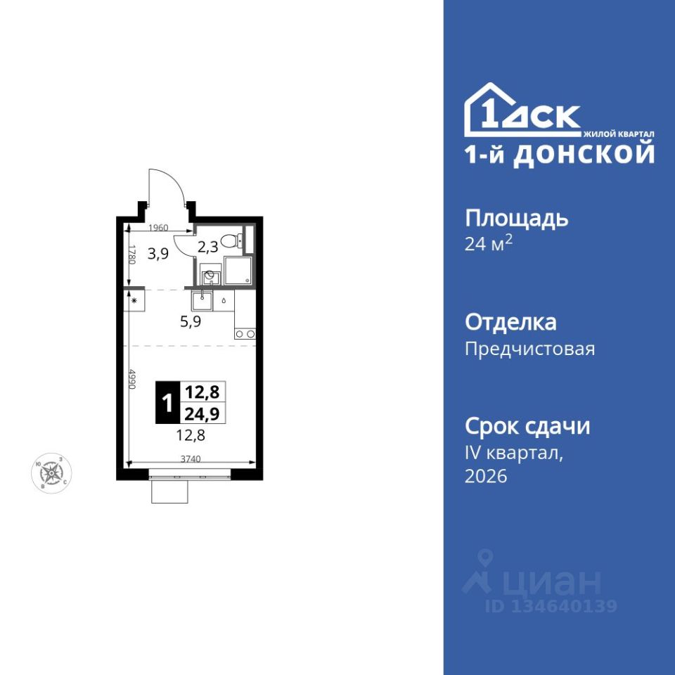 Продаётся квартира-студия номер 482 общей площадью 24.9 кв.м. на 24-м этаже 24 этажного здания. Отделка Whitebox.