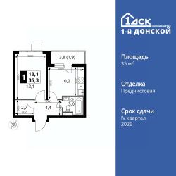 Продаётся 1-к квартира номер 313 общей площадью 35.3 кв.м. на 9-м этаже 24 этажного здания. Отделка Whitebox.